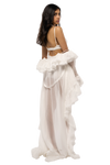 This sheer outer robe inspired is designed for a blend of sophistication and allure, crafted from lightweight, translucent fabric. It features dramatic ruffled detailing along the edges and voluminous sleeves, enhancing its ethereal appearance. The front tie closure allows for an adjustable fit, offering versatility in styling. Functional yet fashionable, this robe serves as an elegant overlay that can be paired with various undergarments or dresses to elevate any ensemble. Its flowing train adds a touch of grace, making it ideal for special occasions or fashion-forward events. Perfect for those seeking a statement piece that combines modern style with classic charm.